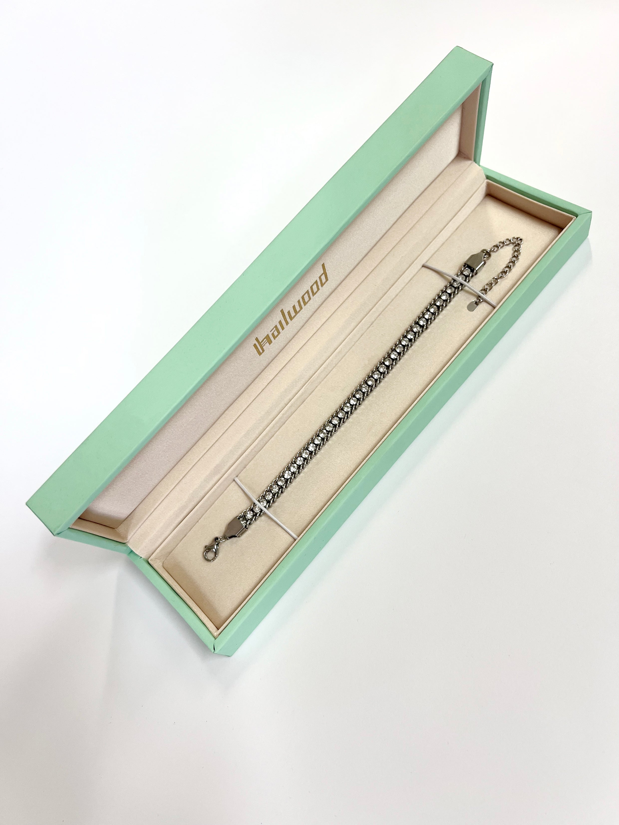A tennis bracelet of square cut crystals and rope twist chain make for a glamorous timeless piece made in stainless steel and plated in gold vermiel.